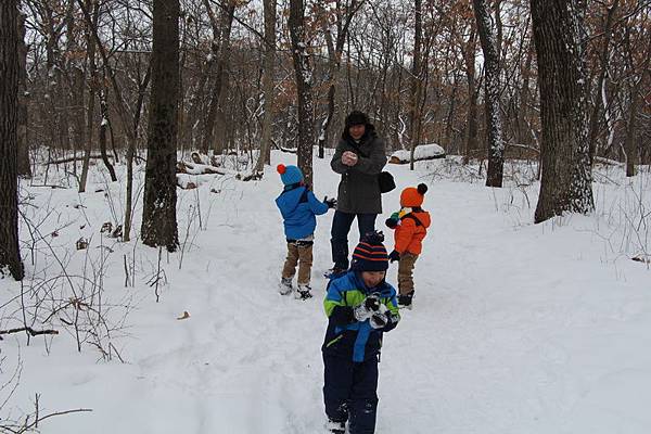 後來小朋友們還一邊走一邊打雪戰,玩得很開心,而孩子王的爸爸就是雪球的無上限供應商