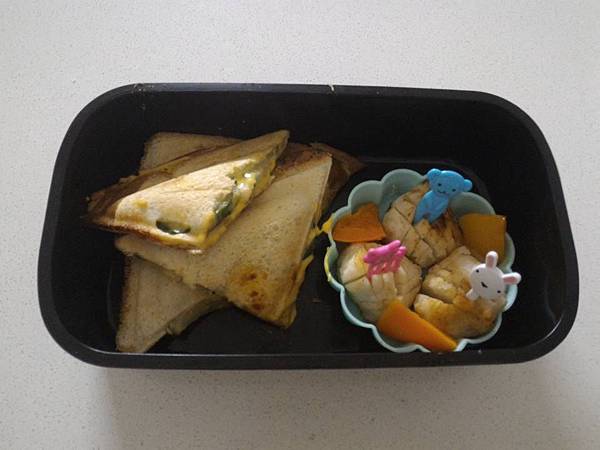 因為美國小孩帶去學校的午餐食物大多是可以用手抓取的,所以我幫小牛準備的餐盒也大多也可以用手拿取的飯糰為主再搭配一些也可以用手拿取的"成塊"蔬果